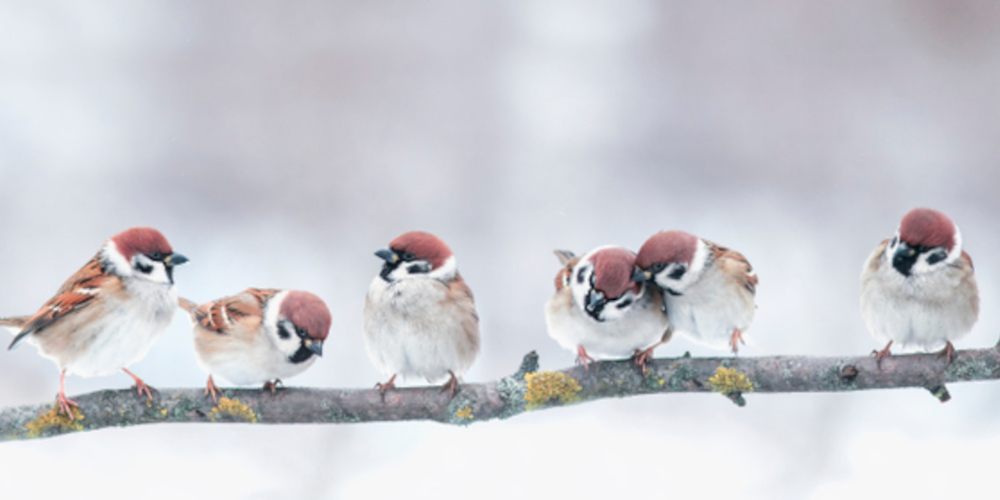Panoramic,Photo,With,A,Group,Of,Small,Funny,Birds,Sparrows