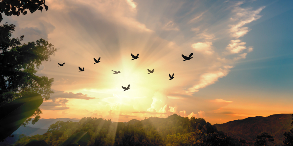 Silhouette,Flock,Of,Birds,Flying,Over,The,Valley,On,Sunbeam